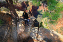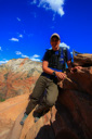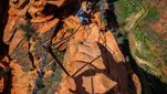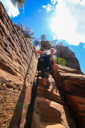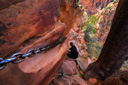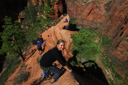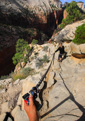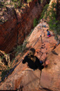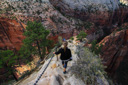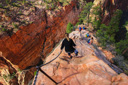 After visiting with the wildlife, we set off towards the perilous trail to the landing—almost immediately, we encountered a large rock outcropping with the first set of chains. We managed to maneuver across this portion of the climb with little difficulty, which lifted our confidence in our ability to tackle the last half-mile that we had heard so much about. What lie ahead, was the infamous knife-edge ridge that leads to the top of Angel’s Landing—in case you still don’t know, let me describe the last half-mile of the trail. The spine of the fin that is Angel’s landing consists of a narrow sandstone crest measuring anywhere from approximately three to ten feet wide with sheer drop-offs on both sides—heavy chains attached to the rocks serve as handrails along most (but not all) of the drop-offs. In addition, footholds have been carved into the rock in several key areas. After the first scramble up a steep knob, where we gained our confidence on the chains, you reach an unprotected walk across a narrow saddle—the phrase razor’s edge has never been more appropriate. Following the saddle, you resume climbing the final pitch to the summit. Those who lack the stomach for this hair-raising adventure often watch the drama unfold from Scout Lookout—the two of us set off to test our mettle.