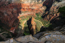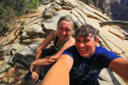 Sook and I took our time scrambling up and over the “step of faith”, climbing higher and higher along the perilous ridge until we were both standing on the summit taking in the phenomenal view—Zion Canyon, The Great White Throne, and Red Arch Mountain can be seen from this commanding point. In addition, the park road and the Virgin River where it forms a horseshoe around a rock formation called The Organ are all visible nearly 1,500 feet below—we had overcome our fear and I was enjoying the view from the summit of Angel’s Landing with my wife, my best friend—what more could anyone ask for? (An easier way down maybe—just kidding.) We spent about 30 minutes taking photos, and eating some snacks, before we decided we had better start down—we didn't want to risk descending a busy trail, where the scary thought of having to pass someone on a narrow section might become a reality.
