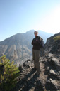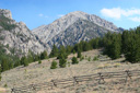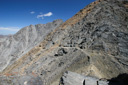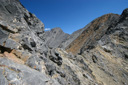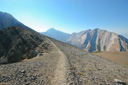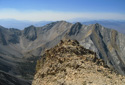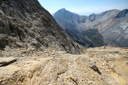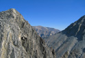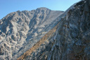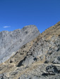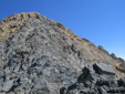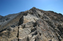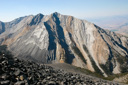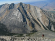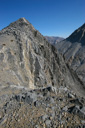 Ahead, the obvious trail continues through the magnificent landscape—we found this to be the most scenic portion of the hike—to the left is an uninterrupted cliff, dropping nearly 800 feet to the Rock Creek basin, and to the right, a talus field slopes gradually down into Cedar Canyon. Above Cedar Canyon rises Peak 11,308, a picturesque charcoal colored mountain with vertical streaks of orange—I think I took over 20 snapshots of this peak alone.