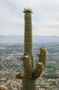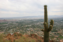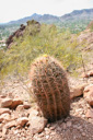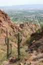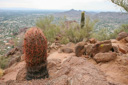 The summit, 1.16 miles from the trailhead, marks the halfway point of the hike and affords a 360-degree view of Phoenix and the surrounding mountain ranges—look for Superstition, Usery, McDowell and Four Peaks. The summit is composed mostly of bare rock with a sheer vertical drop off the east side to the valley below—don’t get too close to the edge. We relaxed on the summit for about 15 minutes before retracing our steps back to the parking lot—pausing for group photos and wide sweeping landscapes complete with towering saguaro cacti. The return journey is much easier, and the handrail really comes in “handy” as you descend the steep slickrock—just take your time and enjoy the desert scenery—especially if the barrel cactus and ocotillo are in bloom, as they were on our June hike. The roundtrip hike of 2.32 miles took us 3 hours to complete, leaving the five us a little tired and hot, but totally charmed by Camelback Mountain—the crown of Phoenix.