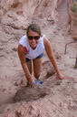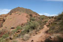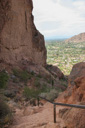 The hike begins at the Echo Canyon parking lot, where you will find a ramada, an interpretive kiosk, and a drinking fountain. The trail descends a few steps and then heads uphill into Echo Canyon—a shallow drainage flanked by rounded cliffs to the north. The trail reaches the top of Echo Canyon in 0.3 miles—a bench at this point allows for a rest stop. Beyond the bench, the trail bends south under the towering east face of The Hump—note the chain link fence to your left that protects the houses below from falling rocks. You might want to take your time along this segment of the trail, because the climbing is about to begin—our first response to the scene ahead was a resounding, “Are you kidding me?”
