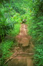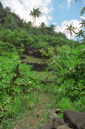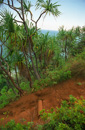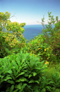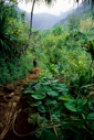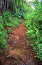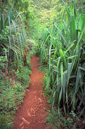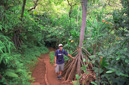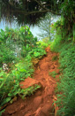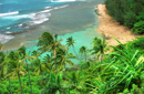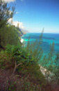 We arrived at Ke'e beach on June 14, 1999—excited and geared up to hike the 2 miles down the trail to Hanakapi'ai Beach. We began our hike at around noon, feeling no pressure to start out early, since we knew the hike would not take too much time—we paused briefly to have our photo taken at the trailhead sign, and then set off into the tropical splendor. Right away, the uneven lava rock path, which is often muddy and sometimes slippery, begins climbing through the lush tropical vegetation. In the first 0.5 miles, the trail provides numerous vista points that overlook Ke’e Beach, and the scalloped Na Pali cliffs.