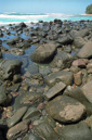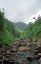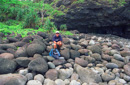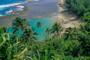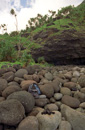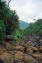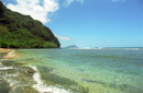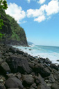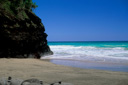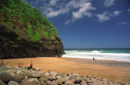 The trail now heads downhill towards the beach, and it is steep so watch your footing. Once you reach sea level, you must cross Hanakapi'ai Stream—do not attempt this crossing if the water level is high, many people have drowned. If safe, cross the stream by hopping across several boulders and then scrambling up a little bank on the other side—once up the bank there are a few small boulders to scramble over, and then you are at the beach. Your first inclination might be to take a swim, but the currents here are dangerous—best to stay out of the ocean here, but if you must venture in, be very attentive to what the ocean is doing and stay close to the shore.