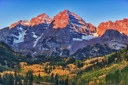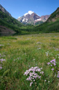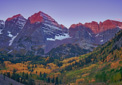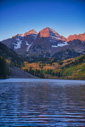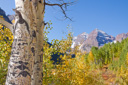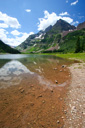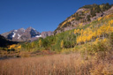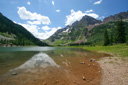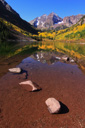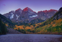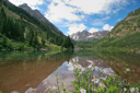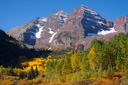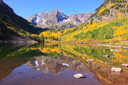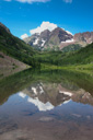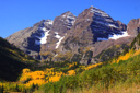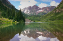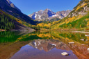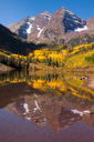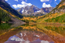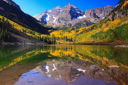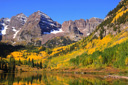 The Maroon Bells, reflecting in the mirror-like surface of Maroon Lake, form a scene that epitomizes the Rocky Mountains of Colorado. From Maroon Lake, you can see into the Maroon Bells-Snowmass Wilderness—a pristine natural environment where miles of hiking trails lure backpackers into the beautiful backcountry. In fact, backpackers and hikers alike consider this place a nirvana, because even the casual hiker can venture down a path amid the towering peaks and alpine lakes—no need for a tent.