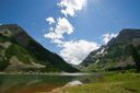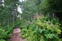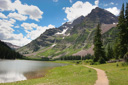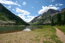 After enjoying the antics of the marmots, we made our way back to Crater Lake—the light was beautiful, and the surface of the lake was so smooth that it practically reflected the entire mountain vista. Adding to the beauty of the day was the fact that the sun was shining brightly, the trees were swaying in the breeze, and people were enjoying their time at the lake—indeed, a perfect summer day. We hated to leave, but it was time to head back down the trail.