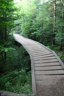 The Van Hoevenberg Trailhead, located at the opposite end of the parking lot from the High Peaks Visitor Information Center (Adirondak Loj area—parking fee $9.00 as of 2007), marked the beginning of our hike—we noted the time and signed the register at 6:48 am. Passing through a stand of pines, we crossed the winding boardwalk over Heart Lake outlet and eventually, entered the High Peaks Wilderness at 0.5 miles—the refreshing scent of pine filled the air, and the sun was slowly lighting up the forest as we made our way towards Marcy Dam—located 2.3 miles into the hike. The wide, well-maintained trail adds to the enjoyment of the hike—trail crews have worked tirelessly to improve the conditions of the path, building reinforced steps, foot planks, corduroy, and stepping stones where needed. No need to worry about getting off track either, the trail is well marked with blue-metal disks nailed to trees and trail junctions are well signed—kudos to the trail crew.