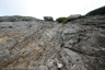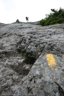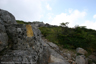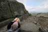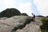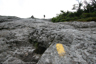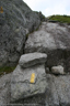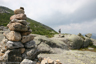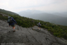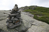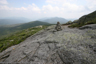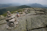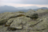 In another half-mile, we reached the Phelps Trail junction (11:44 am/6.7-mile mark)—turn right at this point and climb over a section of boulders and rocky slopes along the flanks of Little Marcy. We had now left the blue disks of the mixed conifer and deciduous forest behind to enter an arctic-alpine environment—the path to the top now marked by rock cairns and yellow blazes painted on the rock surfaces. As you traverse this fragile environment, keep to the principles of “Leave no Trace” and be mindful of your foot placements—stepping or sitting on the rare, fragile, and endangered plants will kill them—stick to the trail and stay on the bare rock.