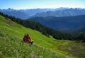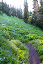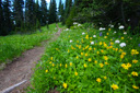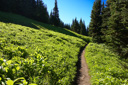 At about the 1-mile mark the trail levels off for a brief stretch, but regains ascending long before you have rested your legs—keep your mind off the climb by studying the pocket meadows for wildflowers such as Mountain arnica, Columbia tiger lily, glacier lily, lupine, bracted lousewort, valerian, and false hellebore.