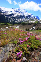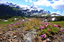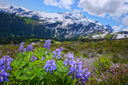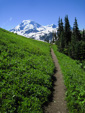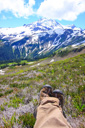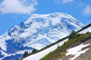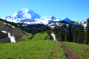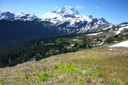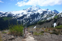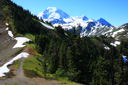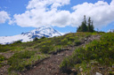 The decision to climb the knoll or skip the ascent, is up to you, but either way you must make the effort to reach the saddle below Chowder Ridge—upon reaching a fork in the trail (located past the knoll) at mile 3.5, take a right and climb along the ridge as far as your legs and the snow will allow. That little voice inside your head will likely be chanting, “Just go a little bit farther”, especially when that snow-covered celestial body exerts its pull on your psyche—how far you actually go is up to you. We decided to turn around at about the 5-mile mark, after enjoying a hiker’s lunch along the ridge amid Indian paintbrush, white paintbrush, lupine, penstemon, glacier lilies, and American bistort—all in the shadow of a jaw-dropping volcano.