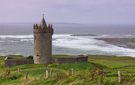 The Cliffs of Moher, one of Ireland’s top visitor attractions, stand unyielding against the crashing waves of the Atlantic—rising from 394 feet at Hag’s Head to 702 feet at their highest just north of O’Brien’s Tower, the cliffs dominate the Clare coast for nearly five miles. From the cliffs, a contender for a place in the “New Seven Wonders”, one can see Galway Bay, the Aran Islands, The Twelve Pins, and the Maum Turk Mountains in Connemara—assuming the rarity of a clear day of course.