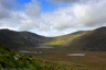 The waterfall attracts shutterbugs that capture one or two shots and then hop back in their car, but to the trained eye, it is obvious that an unseen lake exists above the rocky ridge from which the falls plummet—to access the shores of the lake, begin climbing the granite slabs that angle up from the road to the ridge. As you hike, mind your footfall—only 10,000 years have passed since the last ice melted here, and evidence of alpine glaciations and vegetation are everywhere. Classic U-shaped valleys, such as Glenahoo, and micro-striations on the corrie walls surrounding the lake are clear signs that a glacier masterminded the scenery laid out before you—breathtaking peaks and a crystal-clear lake remain just out of sight.