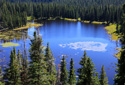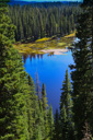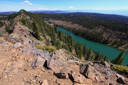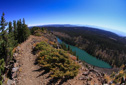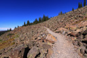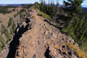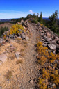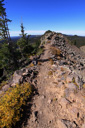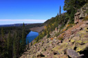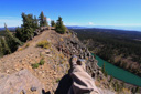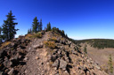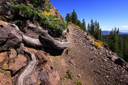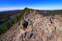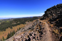 High above Bullfinch Reservoir, along a series of long switchbacks, the trail gains about 900 feet in 2 miles—Butts Lake, nearly a mile long, is now plainly visible as you leave the shady forest for sunshine and boulder fields of jumbled lichen-covered volcanic rubble.
