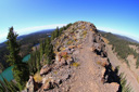 Upon reaching Crag Crest, the trees dwarf and the trail rises to a climactic 360-degree panorama of the Grand Mesa plateau—at times the ridge reduces to a knife-edge barely five feet in width with precipitous drop-offs on both sides, allowing for unparalleled views of the West Elk Wilderness, Uncompahgre Wilderness, Lizard Head Wilderness, and the Raggeds Wilderness, not to mention the chain of lakes on either side of the crest.