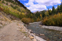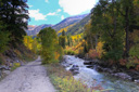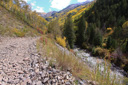 The road levels out after the elevation gain around Beaver Lake and the hike becomes more enjoyable—continue trekking along the bumpy dirt road, taking in the dramatic mountain landscape punctuated by the intense turquoise color of the Crystal River.