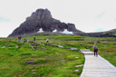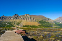 The trail to Hidden Lake Overlook, at 1.5 miles (3.0 miles roundtrip), is located directly behind the Logan Pass Visitor Center. Hidden Lake Overlook is a great trail for easy access to the high country of Glacier National Park—it starts as a boardwalk which climbs about 500 feet through fields of wildflowers (fleabane and glacier lilies are abundant) to Hidden Lake Pass.