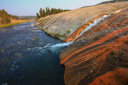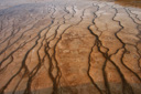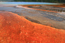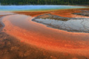 Both springs are extremely large, and it is hard to get a good sense of their beauty from the boardwalk. Grand Prismatic Spring is unbelievable in color and size, and from the boardwalk you can see the ring of red fading into orange, yellow, and then to the blue center of the deep pool. We also noticed a funnel of steam making its way across the surface of the spring like a mini tornado. In contrast, Excelsior Geyser, now considered a spring, is a silty blue color all around. The runoff from this huge spring drains in a colorful orange ribbon down a bank into the Firehole River.