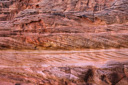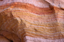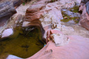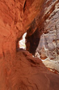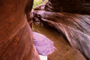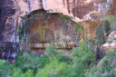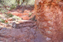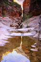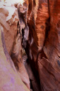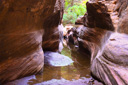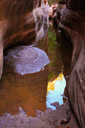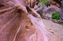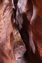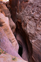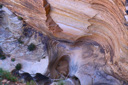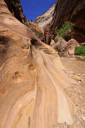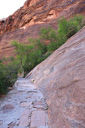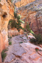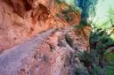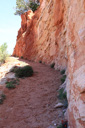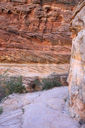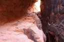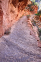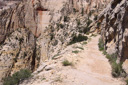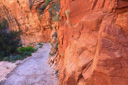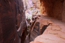 Now following a sandy wash, the trail eventually proceeds along a shelf through the sheer walls of Echo Canyon, which once again plunges into the depths off the side of the trail—shortly, the slot canyon opens into a sun filled bowl surrounded by towering peaks.