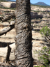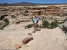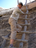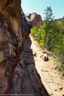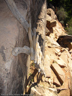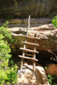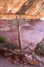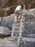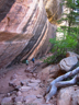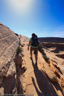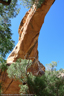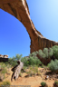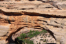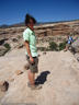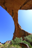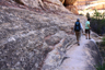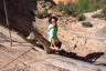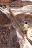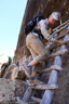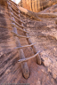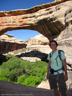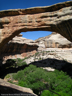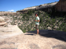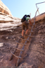 Back on the main trail, descend steadily via switchbacks across the Cedar Mesa—gamble oak, junipers, and buffaloberry line the trail. At the end of the switchbacks the slickrock reappears and Sipapu Bridge towers above—make your way down two short but steep slickrock friction pitches. The steep descent is made easier by the presence of handrails and two short wooden ladders—Dar especially enjoyed the challenge of the wooden ladders.