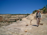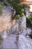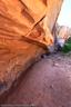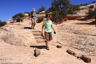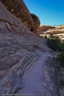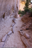 From the Sipapu Trailhead, the trail begins as a rock-outlined route across the slickrock that descends over the rim of White Canyon—occasionally the trail consists of steps carved into the slickrock for better footing.