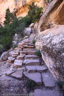 The Sipapu Bridge Trail, located at the bottom of White Canyon in Natural Bridges National Monument, Utah, immediately drops 440 feet in 0.6-mile to the creek bed under the bridge—utilizing slickrock inclines, steel staircases, and wooden ladders to manage the particularly steep sections.