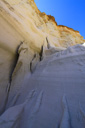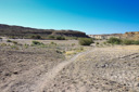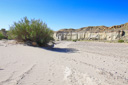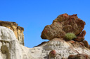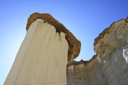 When you arrive at the wash, look for a sign along a rickety fence that reads Wilderness Study Area, No Vehicles, only foot and horse travel permitted—park here and start hiking south along the wash. We set off down the trail armed with sunscreen, bottled water, and sun visors—after hiking in the wash for about thirty minutes, we caught our first glimpse of the towering white pedestals—wow!